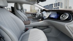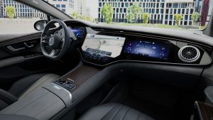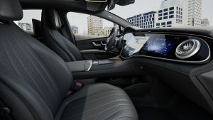 Bước vào khoang xe EQS 580 4MATIC như đang bước vào một không gian của sự hoàn mỹ cấp tiến. Siêu màn hình MBUX trải dài theo chiều rộng khoang lái. Ẩn sau đó là màn hình hiển thị LCD cho ghế lái, màn hình đa phương tiện trung tâm và màn hình cho ghế hành khách với công nghệ OLED.
