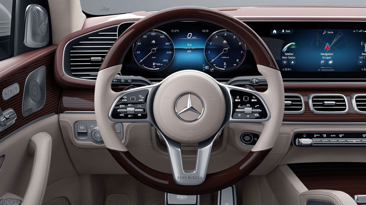 - Vô lăng bọc da Nappa/ốp gỗ cao cấp với ký hiệu “MAYBACH” và các nút điều khiển cảm ứng