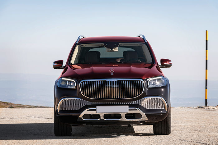 Tính sang trọng được thể hiện qua chi tiết lưới tản nhiệt kích thước lớn, tô điểm bằng các thanh chrome kiểu chạy dọc tinh tế, đặc biệt ấn tượng và giá trị với dòng chữ “Maybach” được đính ở phía trên của khung viền lưới tản nhiệt. Logo “Ngôi sao ba cánh” đặt nhô cao trên nắp capô làm điểm nhấn cho sự sang trọng, quyền uy vốn có của thương hiệu. Cản trước liền khối với các hoạ tiết mắt cáo mạ chrome tạo ra hiệu ứng thị giác khiến chiếc xe rộng hơn, đồng thời chi tiết bảo vệ gầm phía trước cũng được sử dụng chất liệu mạ chrome sáng bóng.